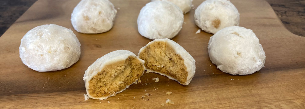 表面にまぶした粉砂糖は雪のように白く輝く見た目と、やさしい甘み、そしてクッキーが空気に直接触れないことでシケにくくなり、長く保存するための知恵でもあります。